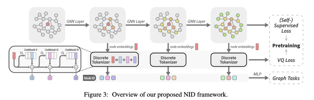 为此,我们提出了一个端到端的向量量化框架 NID,可在自监督或有监督训练过程中,不引入重构损失的前提下,将多层 GNN 嵌入直接量化为若干离散编码(Node IDs)。这些 Node IDs 具有以下特点:
