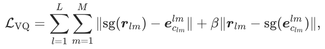 是权重参数。上式中的第一项是 codebook loss [3],它仅影响 codebook,使所选代码向量与节点嵌入接近。第二项是commitment loss [3],它仅影响节点嵌入,并确保节点嵌入与所选代码向量接近。