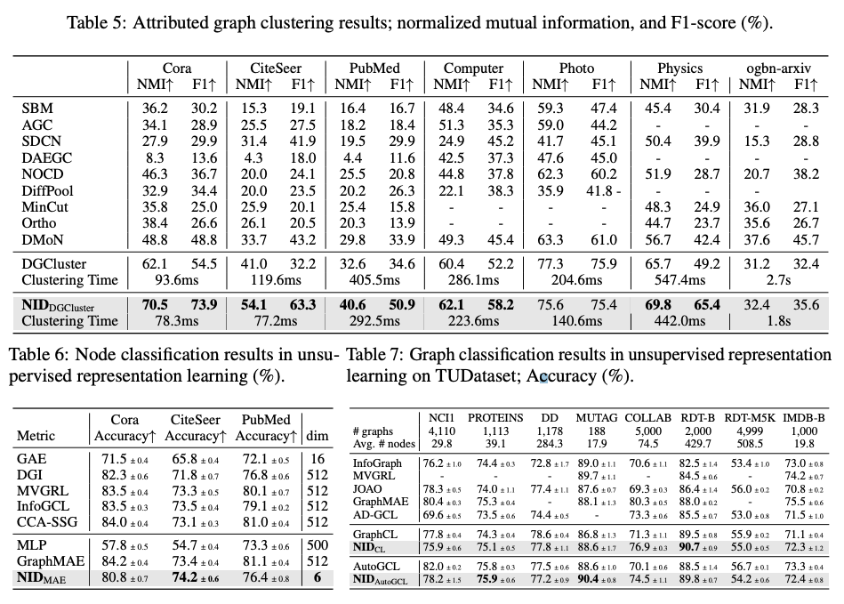 2、信息保留充分:在34个数据集的节点分类、图分类、链接预测和带属性图聚类任务中,Node IDs 在高效推理的同时,性能与最先进模型相当或更优。