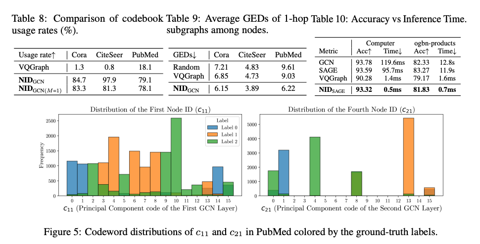 我们提出的 NID 框架可在自监督或有监督训练过程中,不引入重构损失的前提下,将多层 GNN 的连续嵌入直接量化为紧凑、离散且可解释的 Node IDs。通过广泛的实验与消融研究,我们验证了 Node IDs 在多任务、多数据集上的 高效性与实用性。相比传统 GNN 嵌入,Node IDs 不仅大幅降低推理时的内存与计算开销,而且在一系列场景中保 持了有竞争力甚至更佳的预测性能。这一方法为在大规模图上实现实时、高效的推理提供了新的⻅解,也为后续在图数据与大模型结合(如图标记化、LLMs 应用)带来了新的思路。