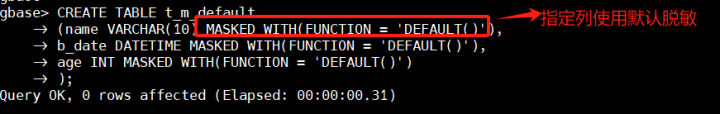 CREATE TABLE t_m_default (name VARCHAR(10) MASKED WITH(FUNCTION = 'DEFAULT()'), b_date DATETIME MASKED WITH(FUNCTION = 'DEFAULT()'), age INT MASKED WITH(FUNCTION = 'DEFAULT()') );