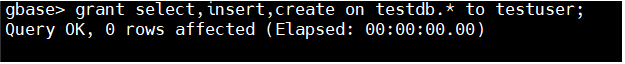 授予testuser用户对库testdb的操作权限,例如授于create、select、insert权限(有其它权限需求,可以根据需求授权) grant select,insert,create on testdb.* to testuser;
