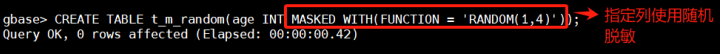 假设设置脱敏范围为(1,4)。 CREATE TABLE t_m_random(age INT MASKED WITH(FUNCTION = 'RANDOM(1,4)'));