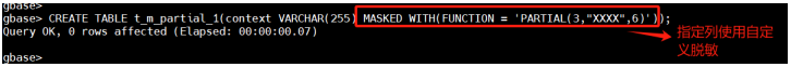 设定 prefix 为 3,suffix 为 6,padding 字符“XXXX”。 CREATE TABLE t_m_partial_1(context VARCHAR(255) MASKED WITH(FUNCTION = 'PARTIAL(3,"XXXX",6)'));