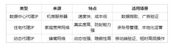 代理IP是一种通过第三方服务器中转网络请求的技术,可隐藏用户真实IP地址,并模拟特定地理位置的网络访问。根据来源与用途,代理IP可分为以下三类: