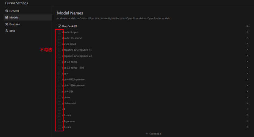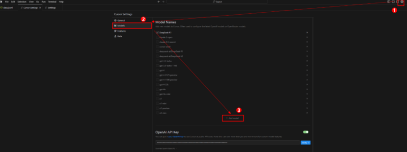 (1) 点击 Cursor 界面右上角设置按钮进入设置界面,进入 Models 页签,点击 Add Model