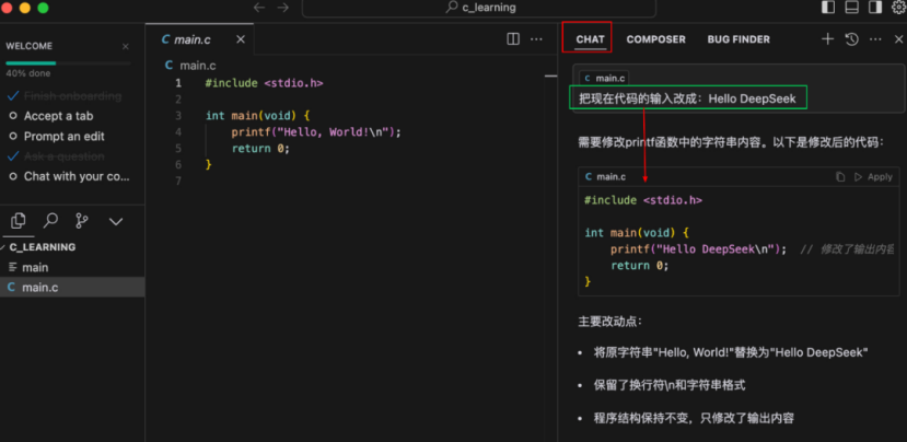 在代码编辑界面,红框处选择刚配置好的模型即可进行对话、代码生成、代码解析等操作。