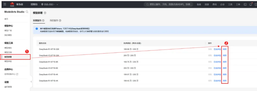 华为云昇腾基于 ModelArts 推理 2.0 适配了该模型,使得性能提 300% 以上。ModelArts Studio(MaaS)将 Deepseek 系列模型部署到平台,支持广大开发者在线体验或端外调用。同时,平台提供免费 token 支持开发者免费使用,帮助他们快速验证和实现创新应用。