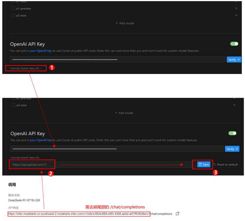 (5)点击 override openai base url 修改基础接口地址,填入 MaaS 调用界面上的接口地址后(需去掉尾部的/chat/completions),点击保存