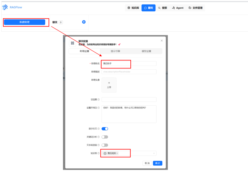 在“聊天”页签点击“新建助理”,自定义姓名后选择之前步骤中创建好的知识库