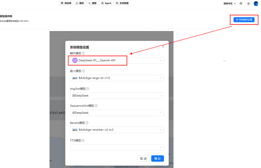 在模型供应商界面点击“系统模型设置”,将聊天模型设置为刚配置好的 MaaS 模型。嵌入和 Rerank 模型可使用系统预置的。
