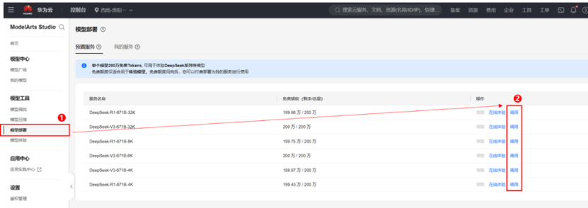 -领取后找到已领取额度的模型服务,然后点击 “调用”;