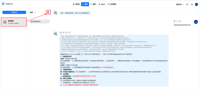 选择创建好的 AI 助理,点击旁边的蓝色加号即可开始进行文档问答,模型会基于外挂的知识库中的内容进行问题答复;回答效果示例如下:
