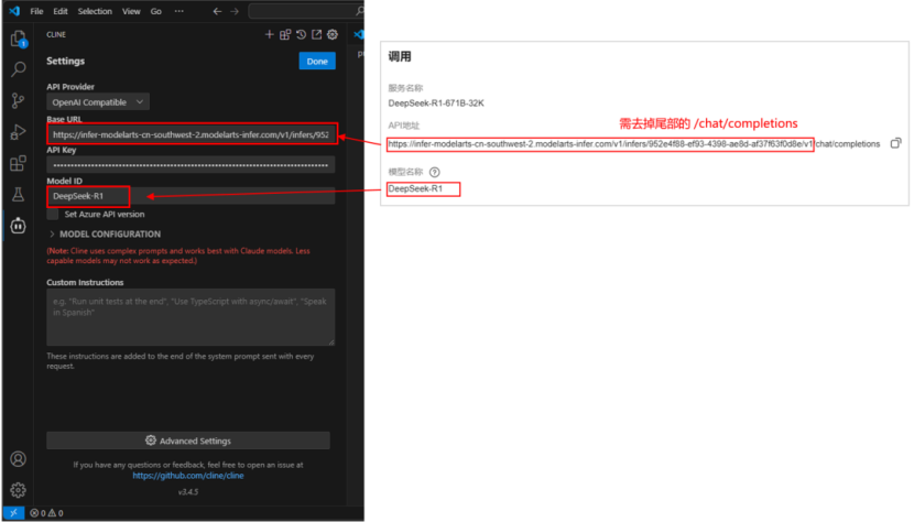 Base URL:MaaS 服务调用界面的 API 地址,去掉尾部的/chat/completions 后填入