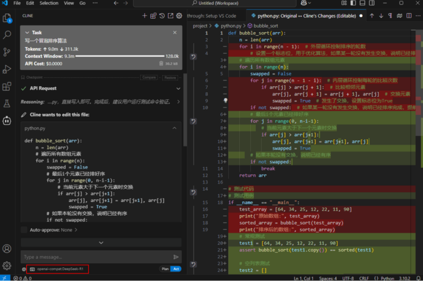 Cline 功能强大,可以进行代码生成,对写好的代码进行纠错、优化等操作,示例效果如下图。