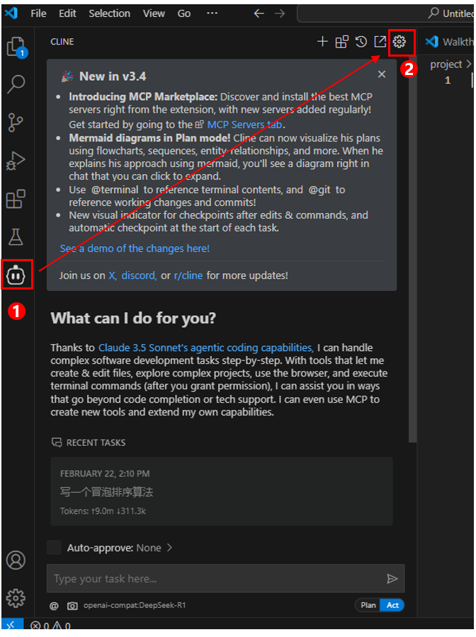 (1)点击 VScode 界面侧边栏的 Cline 机器人 logo,然后点击右上方设置按钮。