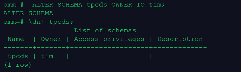 omm=# ALTER SCHEMA tpcds OWNER TO tim;