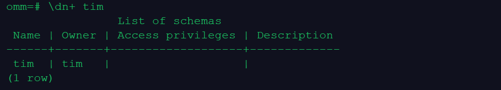 2.创建一个用户tim, 并将tpcds的owner修改为tim,且修改owner前后分别使用\dn+查看模式信息