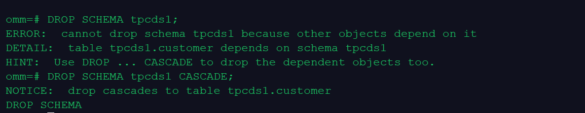 omm=# DROP SCHEMA tpcds1; ----下一步加上CASCADE 再执行一遍