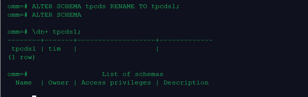 omm=# ALTER SCHEMA tpcds RENAME TO tpcds1;