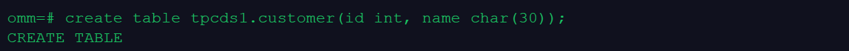 在模式tpcds1中建表customer,语句如下:omm=# create table tpcds1.customer(id int, name char(30));