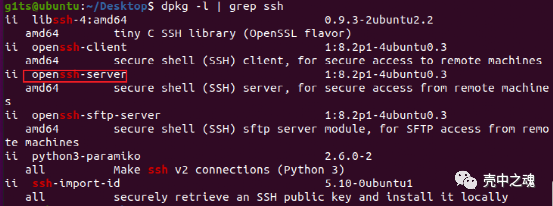 dpkg -l | grep ssh //查看是否安装了ssh服务,默认只安装了ssh-client服务。sudo apt-get install openssh-serverdpkg -l | grep sshps -e | grep ssh //查看服务是否开启