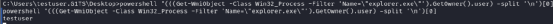 powershell "(((Get-WmiObject -Class Win32_Process -Filter 'Name=\"explorer.exe\"').GetOwner().user) -split '\n')[0]