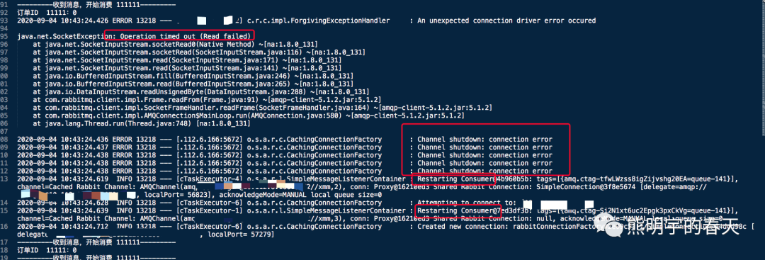 2、经过在测试环境验证,切换完后,生产者不会报错,消费者会有报错,由于路由发生变化,指向ABC的channel被销毁,所以报错,但是不影响消费者继续指向DEF继续消费;消费端基于新的server创建channel,继续消费.报错信息如下: