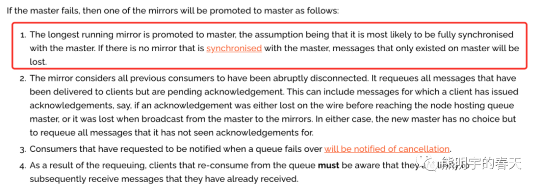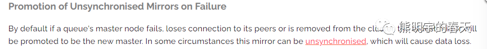 4、这种强制提升新的master的操作会引起数据丢失(如果存在Unsynchronised mirrors队列) ,(造成不同步的队列很有可能是新的镜像队列,新的镜像队列不会主动同步主队列的老数据,它只关心新数据) , 如下官网介绍: