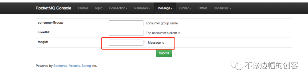 RocketMQ console中,提供了根据msgId查询的入口,你只需要输入一个msgId即可查询,如下图: