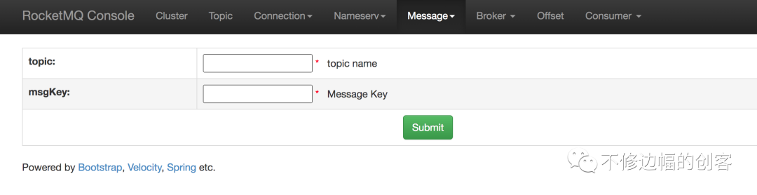 如下图所示,RocketMQ的console中提供了基于msgKey查询的接口,topic和key必须填写,如下图所示: