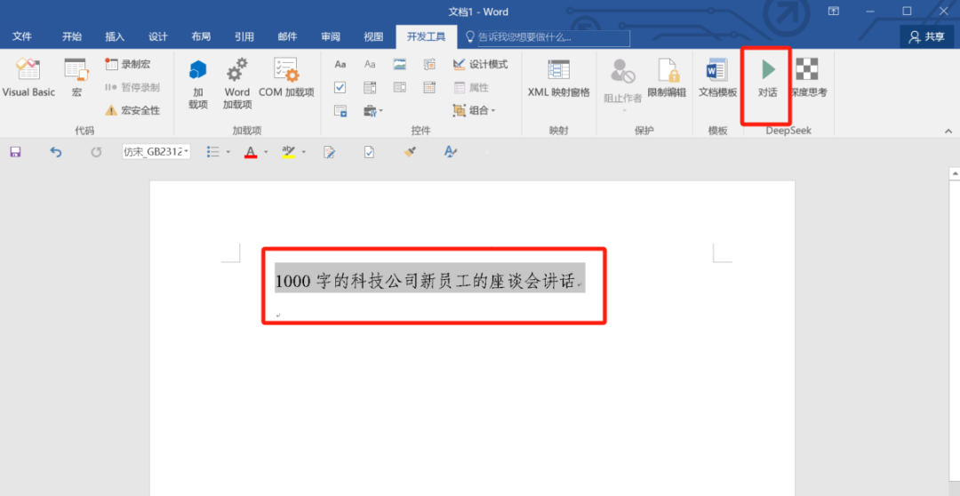新建一个文档,输入如下内容,选择文字后,点击"对话"