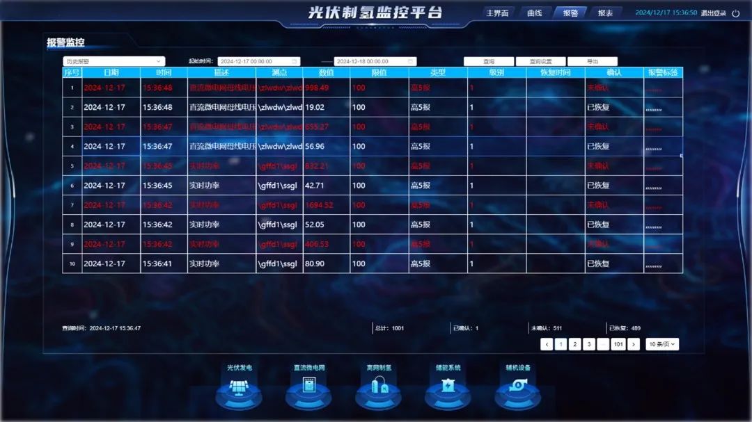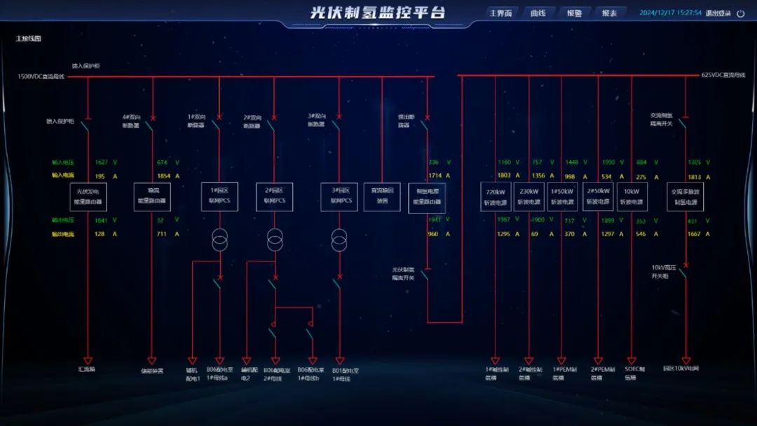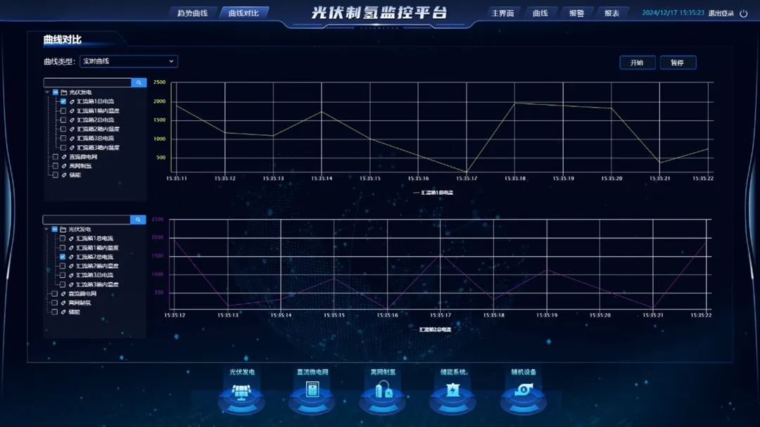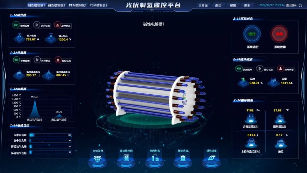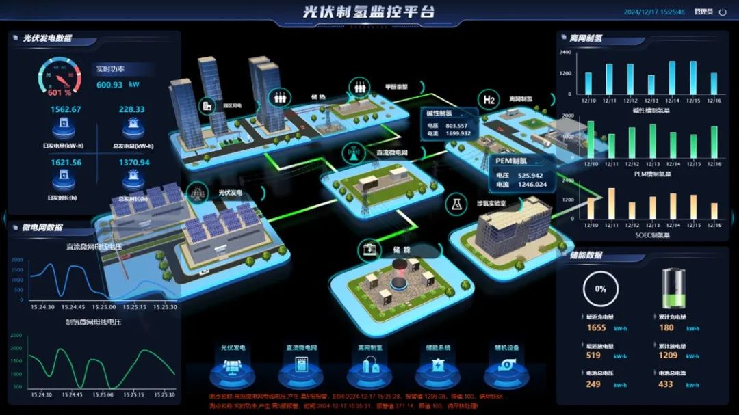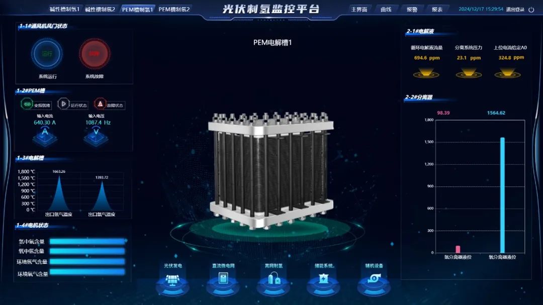 3)离网制氢:跟踪两种制氢设备运行状态、原料消耗、氢含量等数据,支持模式切换与效率分析。