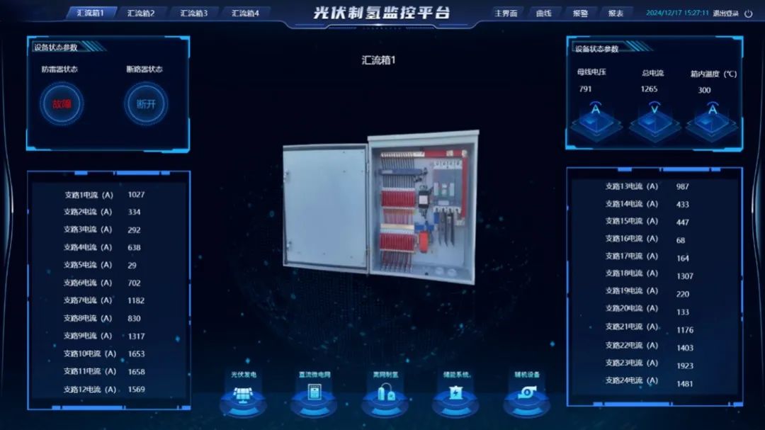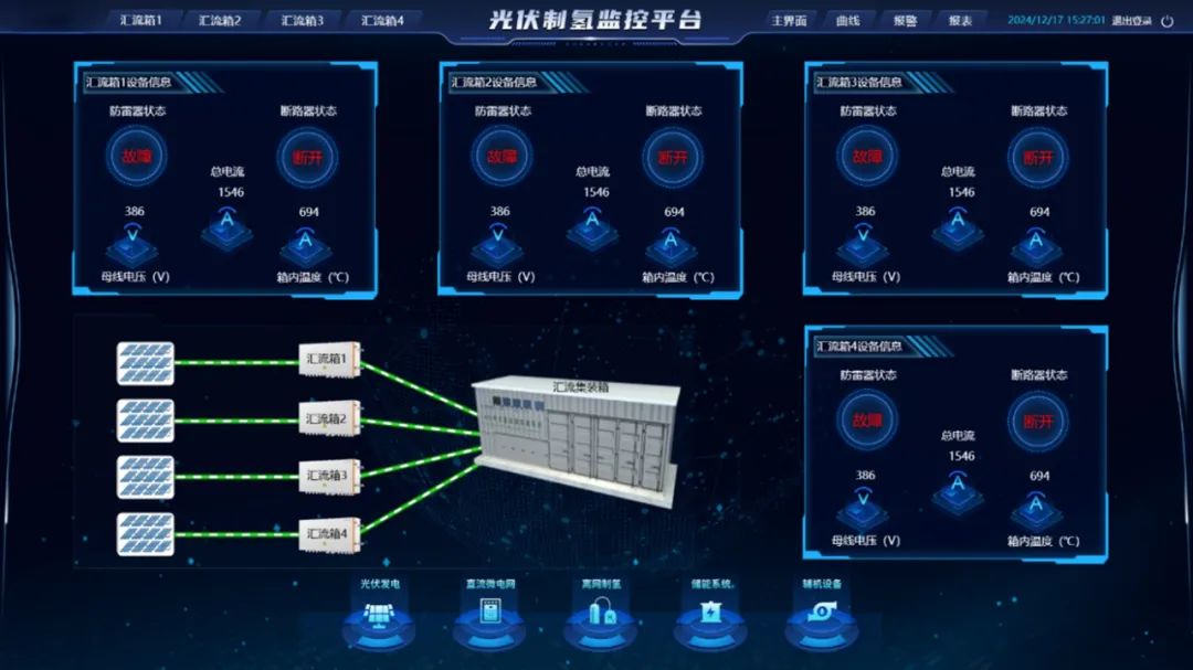 1)光伏发电:实时监测多个汇流箱状态、支路电流及发电效率,异常数据高亮提示。