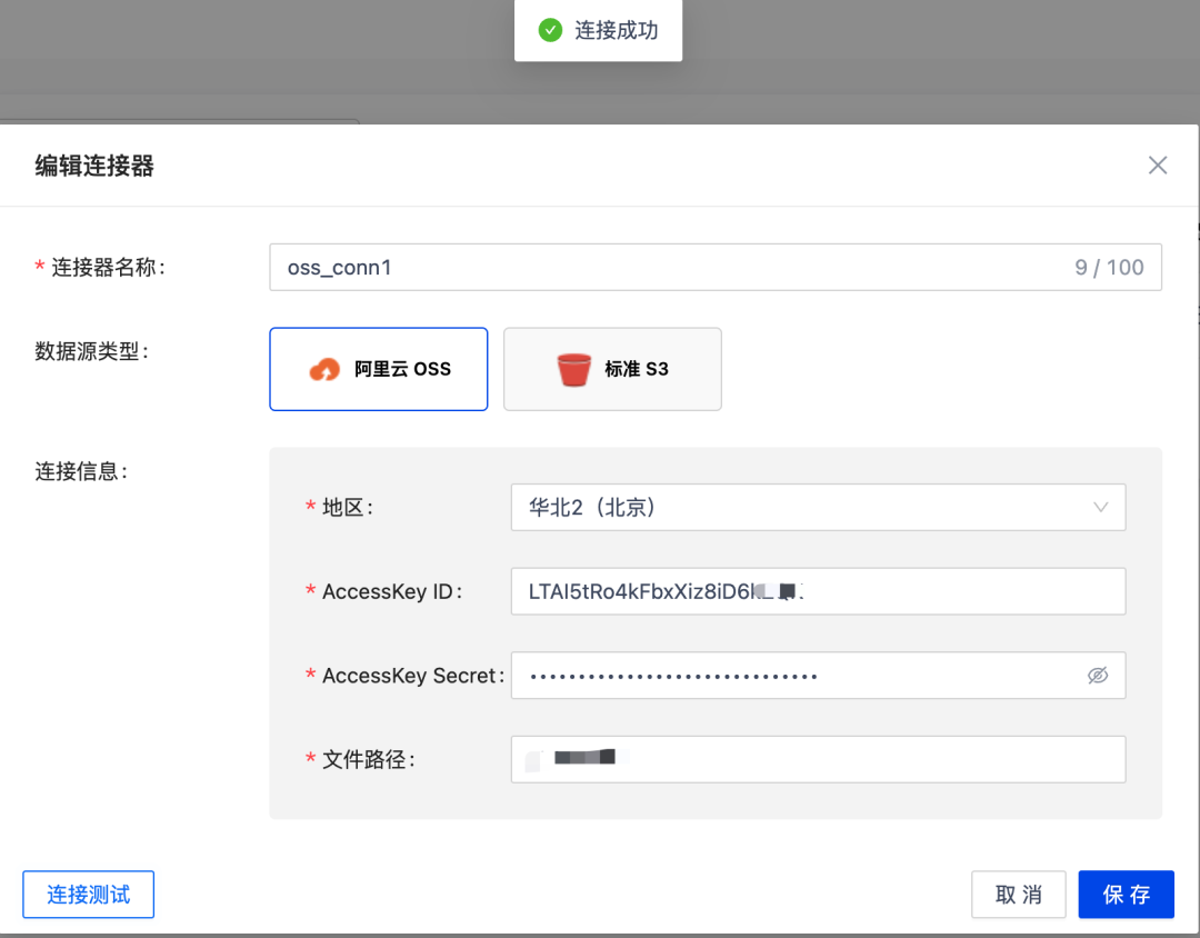 进入数据接入→连接器→点击右上角创建连接器,填写阿里云 OSS 的连接信息,点击【测试连接】确保信息正确,最后点击保存即可完成连接器的创建。