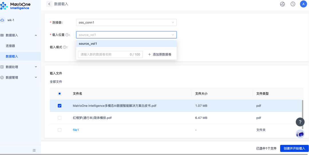 进入数据接入→数据载入页面,点击右上角载入数据,选择刚创建的阿里云 OSS 连接器作为连接源,将数据载入位置设置为添加原数据卷,载入模式选择一次载入。然后选中需要载入的文件,等待任务状态显示完成即可。