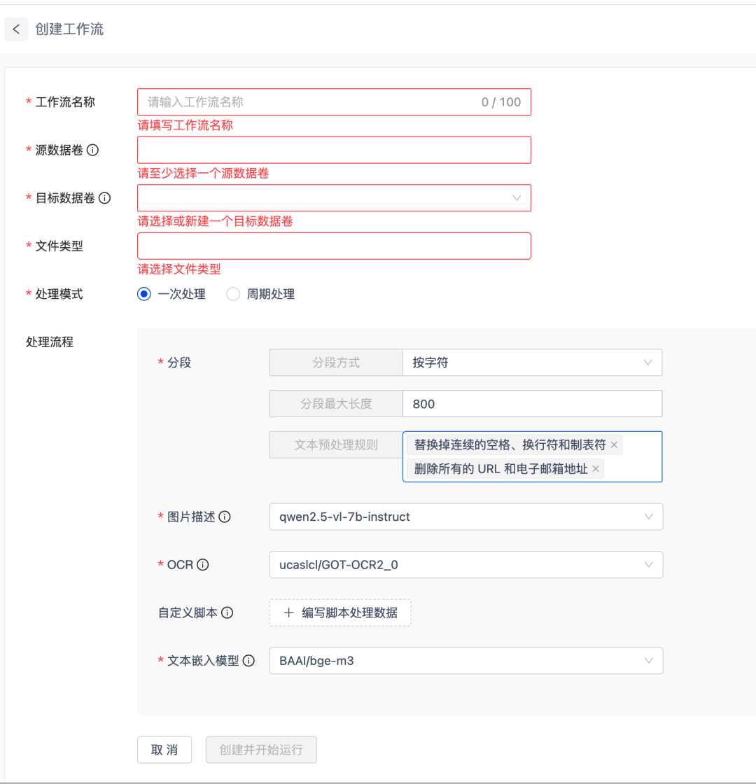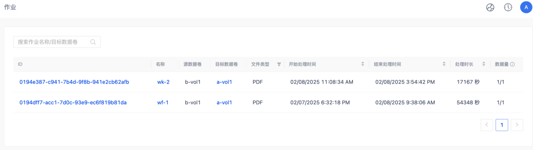 进入数据处理→工作流页面,点击创建工作流,输入工作流名称,选择前一步创建的原数据卷作为源数据卷。目标数据卷选择添加目标数据卷,文件类型设为 PDF,处理模式设为一次处理,流程默认即可。创建后等待工作流状态显示为完成。