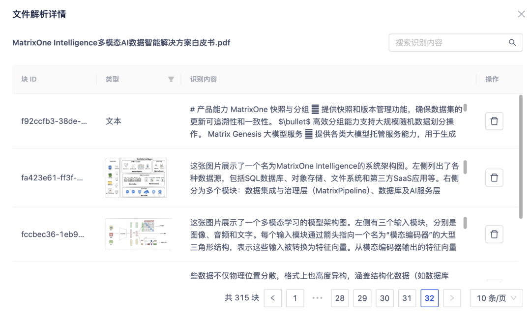 用户可以通过菜单栏的数据探索选项进入 Catalog 页面。在该页面中,用户可以浏览并定位到之前创建的目标数据卷。通过点击文件名称,用户可以查看文件的详细解析情况,包括文本和图片信息的提取和处理结果。