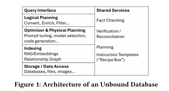 论文的主要贡献在于提出了一种全新的数据库系统架构——“无界数据库”,该架构利用AI技术(如深度学习和生成式模型)来处理和查询包括非结构化数据(如文本、图像和视频)在内的所有类型的数据。论文强调了声明式编程范式在关系型数据库中的成功,并主张将其扩展到AI数据系统,使用户能够通过简洁的查询描述需求,而系统负责优化执行策略。为了验证这一概念,论文展示了多个实例系统(如VAAS和Palimpzest),这些系统在处理非结构化数据方面展现了巨大潜力。同时,论文深入探讨了构建“无界数据库”所面临的技术挑战(如可扩展性、正确性和可靠性),并提出了通过提示调优、模型选择和代码生成等优化技术来应对这些挑战的可能路径。最终,论文不仅为未来研究提供了明确的方向,还推动了数据库技术向更广泛和复杂应用场景的演进,旨在实现高效查询和处理全球范围内的所有数据。