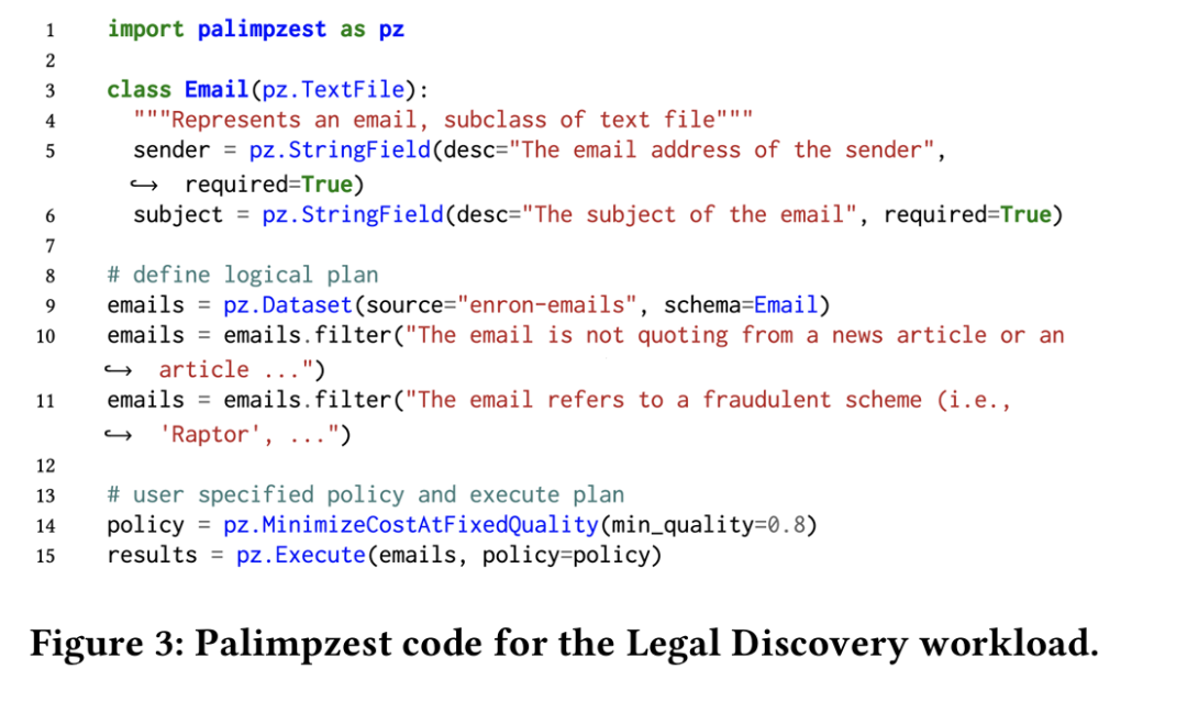 例如,在法律发现任务中,用户可以通过几行代码定义如何过滤和提取与欺诈投资相关的电子邮件。