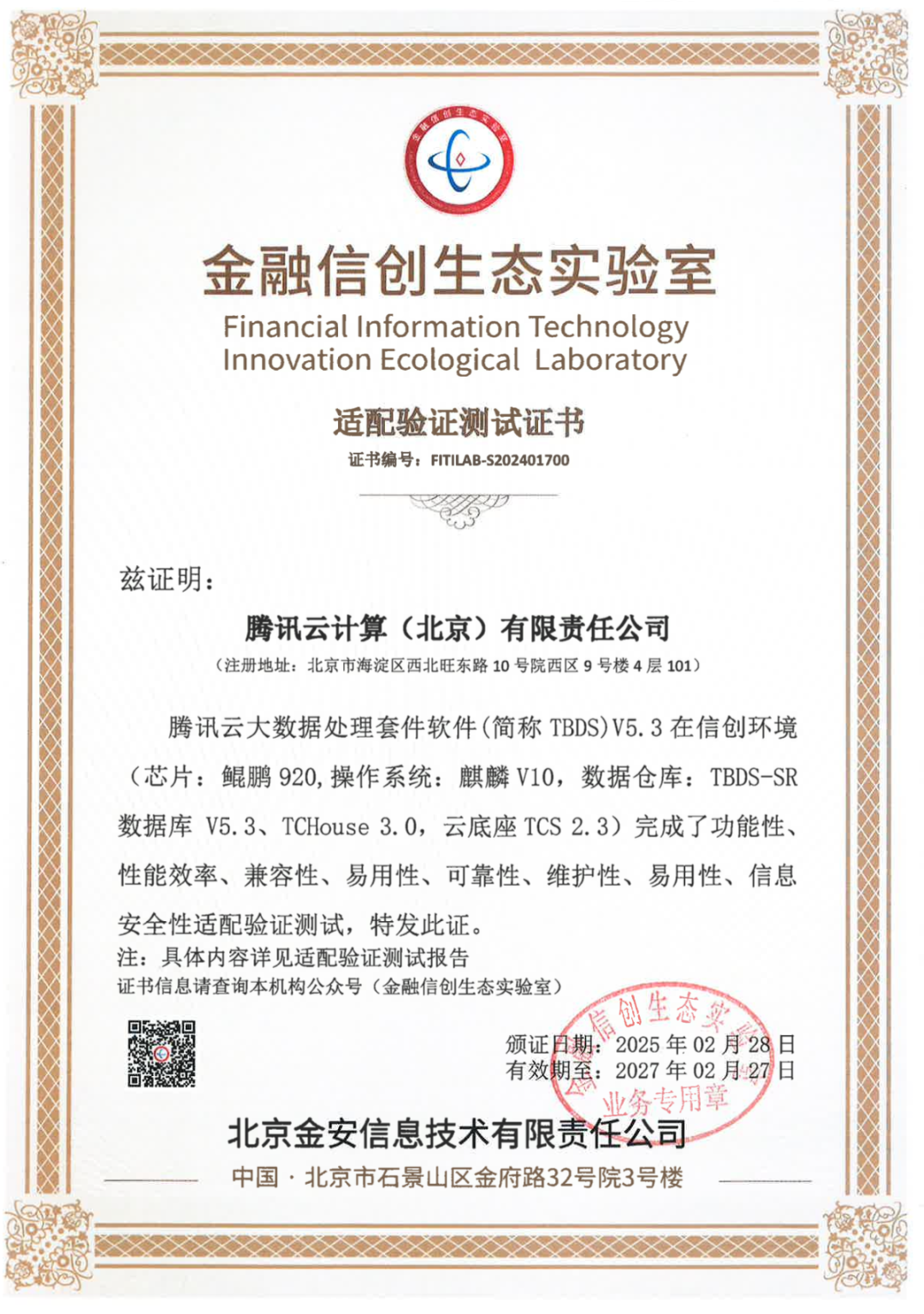 近日,腾讯云大数据套件软件TBDS V5.3、数据仓库TCHouse V3.0通过金融信创生态实验室(以下简称“实验室”)的适配验证。