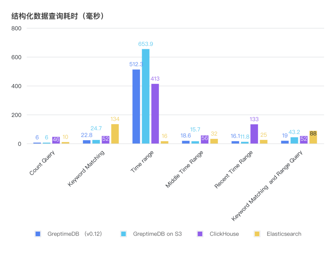 GreptimeDB 和 ClickHouse 在结构化数据的查询性能上各有优劣,但总的来说三者性能差距不大。 在指定扫描时间段较大时,GreptimeDB 和 ClickHouse 的性能下降较为明显,但是能够在几百毫秒内完成查询。 得益于 GreptimeDB 的多级缓存设计,在使用 S3 存储数据时 GreptimeDB 的查询性能并未出现明显降低。
