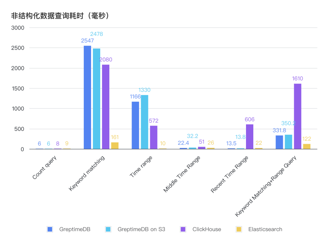 | 查询类别和耗时(毫秒) | GreptimeDB | GreptimeDB on S3 | ClickHouse | Elasticsearch |