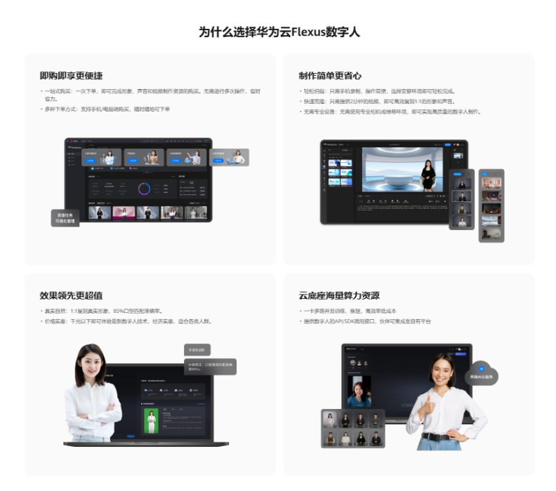 作为一款专为中小企业客户量身打造的数字人产品,Flexus 数字人提供了 1080P 的实景数字人展示,具备 1 分钟语料声音克隆能力和 120 分钟的 1080P 视频制作能力,支持套餐式的下单方式,只需在华为云官网打包购买,就可获得上述所有资源。而且还提供了多种下单方式,无论是在办公室使用电脑,还是在外出时通过手机,都可以轻松完成购买流程,这种灵活性不仅提升了用户体验,还确保了购买过程的高效便捷,真正实现了随时随地的服务获取。