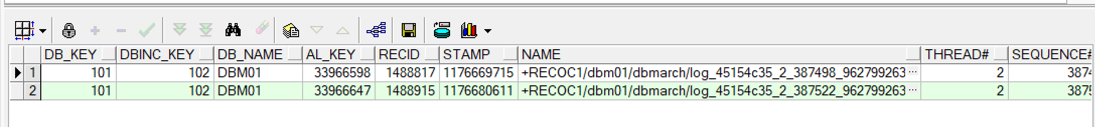 select * from rc_archived_log a where a.db_name ='DBM01' and a.thread#='2' and a.sequence# in('387498','387522');