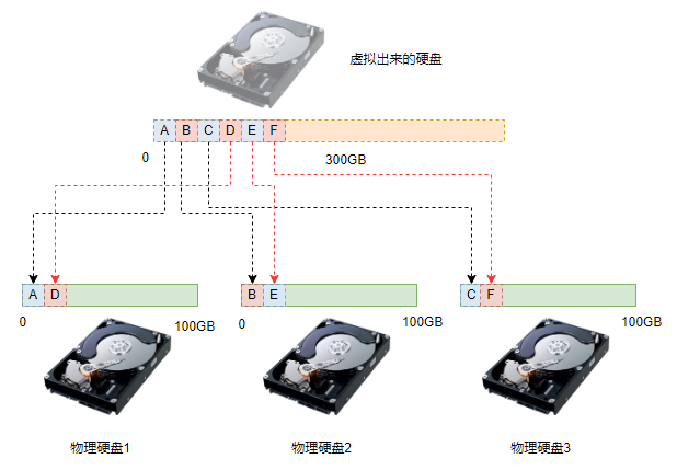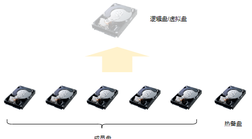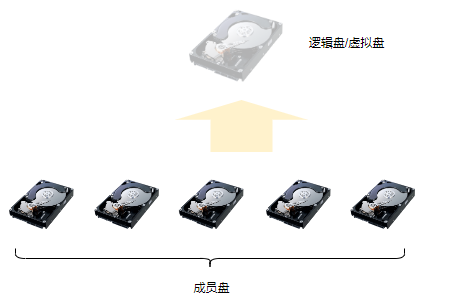 我们知道RAID的核心功能就是将多个物理硬盘构建为一个虚拟的硬盘。构成同一个RAID的多个物理硬盘称为成员盘,因为他是这个特定RAID的一个成员。虚拟出来的,可以被用户使用的硬盘称为逻辑盘或者虚拟盘,如下图是成员盘与逻辑盘的关系。