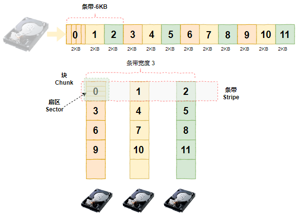 结合上图,上述被分割成的数据块称为条带(Stripe),对于一个创建好的RAID,条带的大小是固定的(本例为6KB)。对于一个条带,每个成员盘上的数据大小是相等的,条带在每个成员盘上的数据称为块(Chunk),也有的书上称为条带段(Stripe Segment)或者条带深度(Strip Size)。关于条带几个相关的概念简单解释如下:
