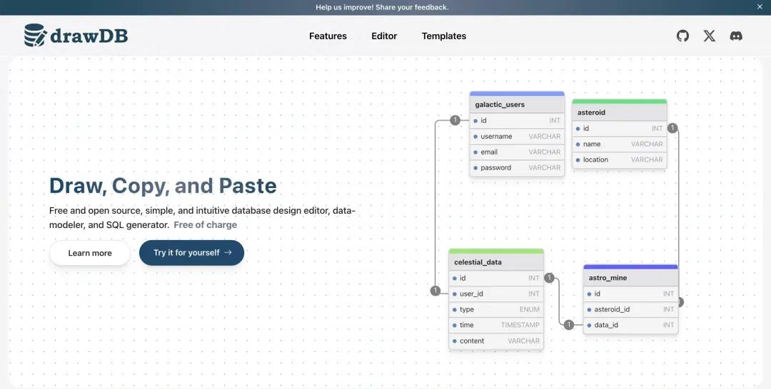 DrawDB是一个开源的数据库设计可视化和管理工具,它通过图形化界面将数据库设计的复杂性降到最低,无论是新手开发者还是资深数据库管理员,都可以借助DrawDB来轻松地通过拖放操作创建和管理数据库结构,无需注册,完全免费使用,在日常工作中更加高效地设计和优化数据库。