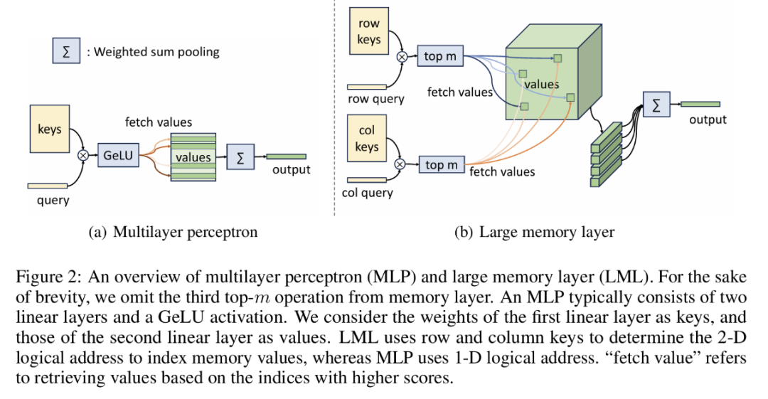 这里论文首先介绍了原版的基于Product key的大存储层(LML),它是作者团队提出的方法的基础。PKM的概念是在之前的工作中由Lample团队提出的。在他们的方法中,作者将外部存储模块整合到语言模型中,扩展模型参数的同时保持类似常数的计算复杂性。总体结构图如(b)所示。